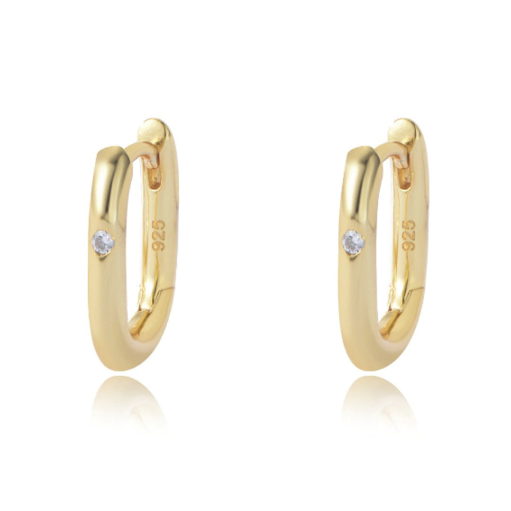 These 18K gold, U-shaped huggies feature a cubic zirconia stone on slightly thicker metal for just a little added detail in your stack. Pair with other studs or even a few more huggies to perfect the layered look. Hand-crafted using 18K gold plated sterling silver.